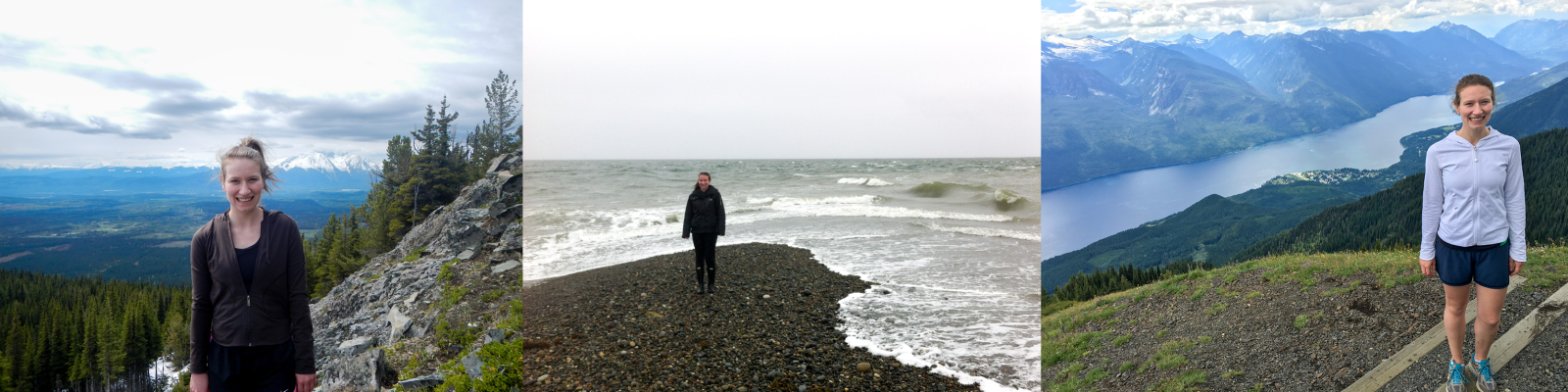 Images (L-R), all courtesy of Brooke Caruth: Brooke Caruth, BSc(Pharm)‘16 in Smithers. Brooke in Haida Gwaii; Brooke in Queen Charlotte City.